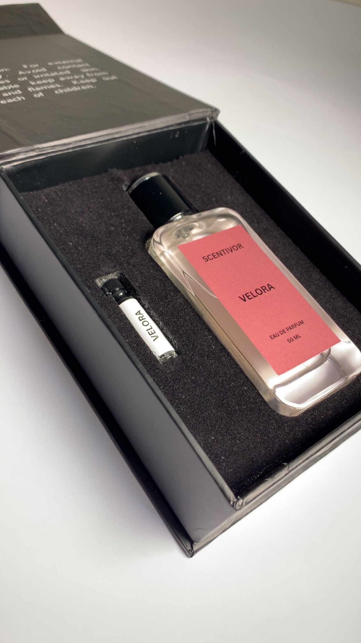 Velora is the essence of modern seduction — effortlessly fresh yet deeply sensual. It opens with a sparkling burst of lemon and crisp aromatics, instantly energizing the senses. As it evolves, smooth musk and soft woods emerge, blending with warm amber for a lingering trail that is both intimate and unforgettable. Velora balances light and dark, freshness and depth — a fragrance that feels like skin kissed by sunlight yet wrapped in mystery.